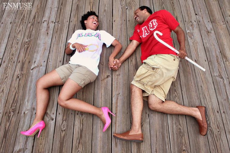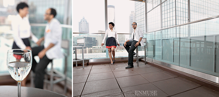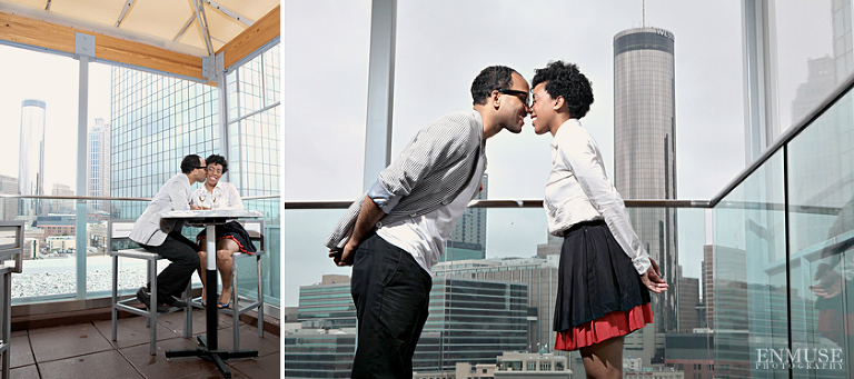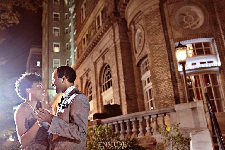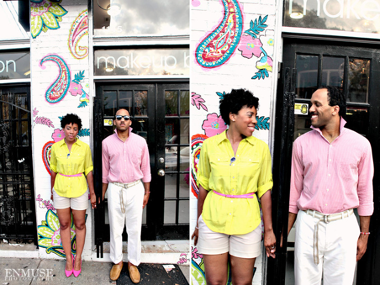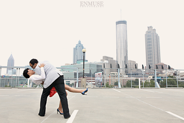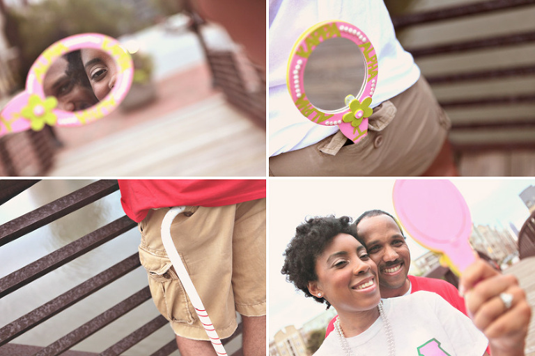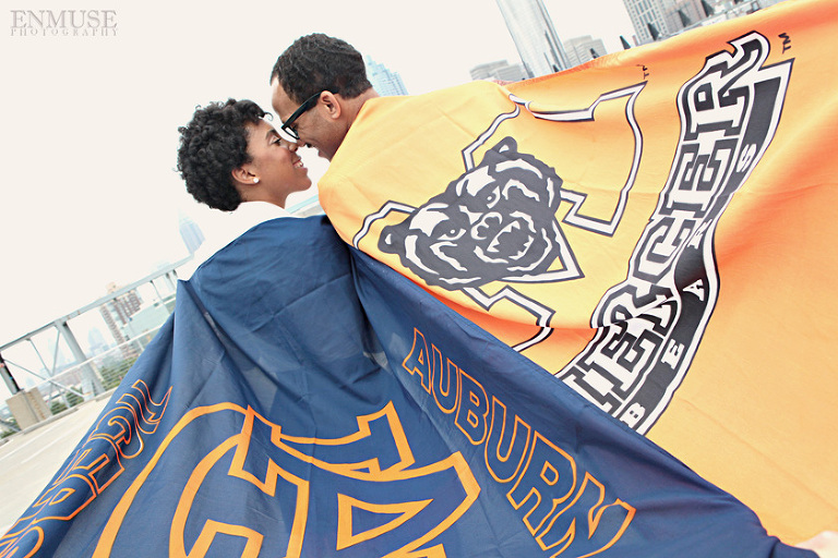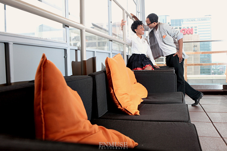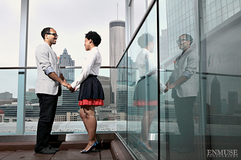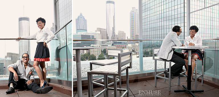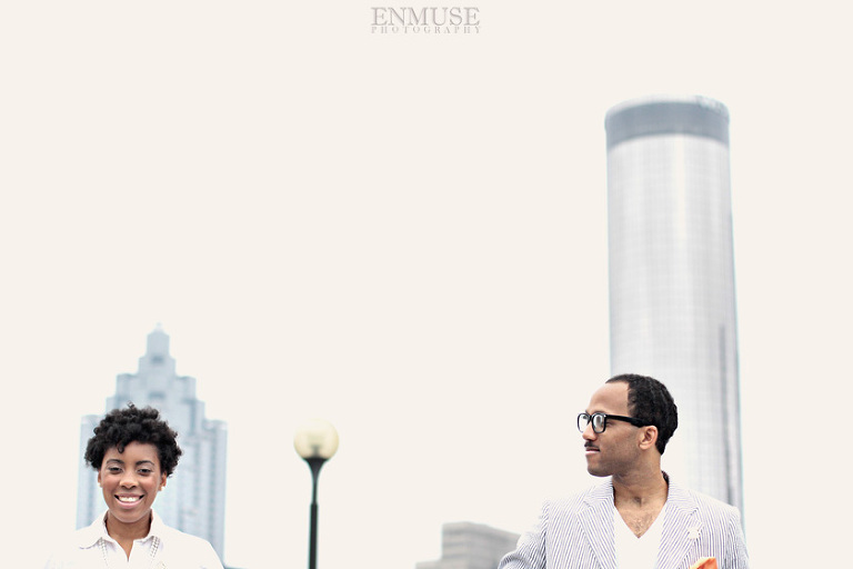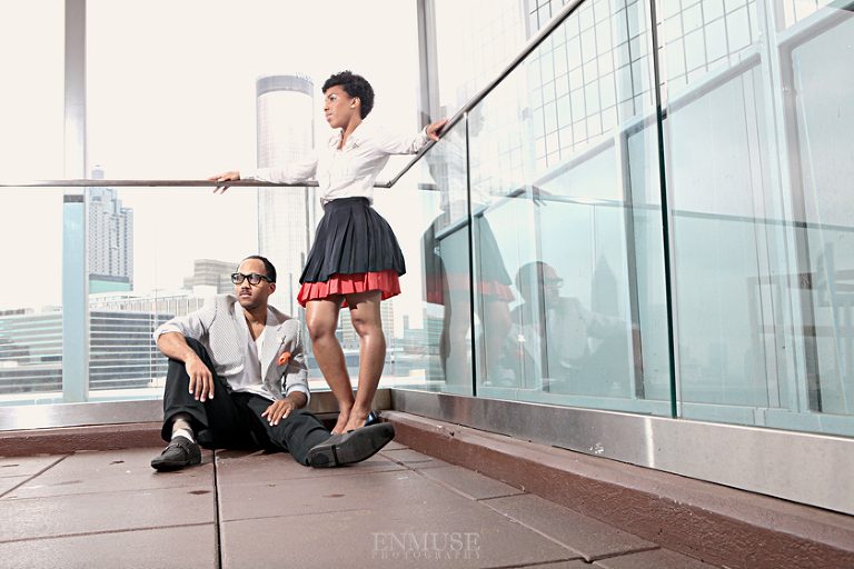 We then hopped over to the Little Five Points area where it is known for multitudes of graffiti and colored walls. Apparently the colors brought the “colorful” character of Tiffany and Michael as they did tons of fun and wacky expressions. Our next stop was the Glenn Hotel where we wanted to incorporate an editorial look of the lovebirds with the Atlanta skyline. Oh, and not to forget, their collegiate “capes” and fraternity/sorority icons: a pink mirror and a white cane.