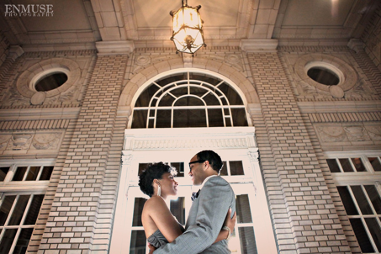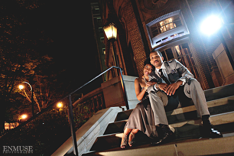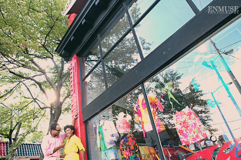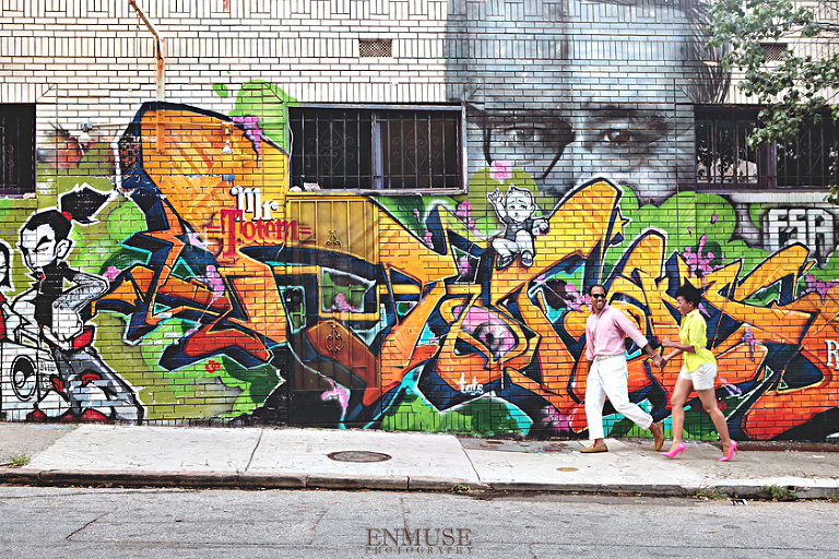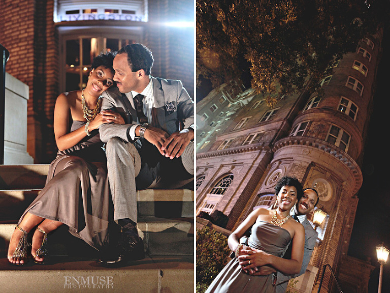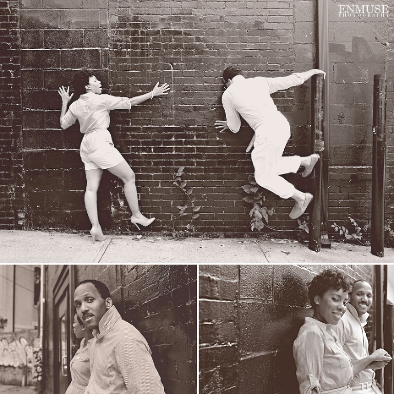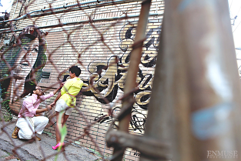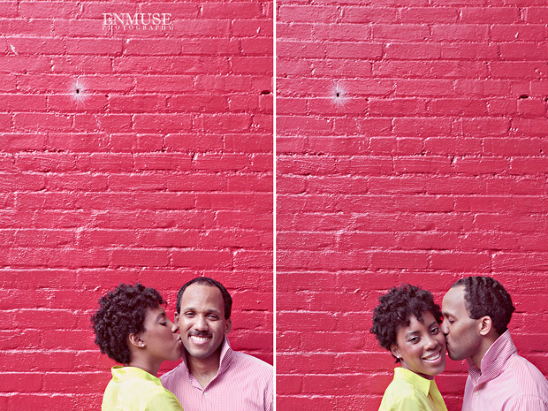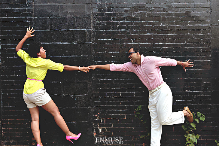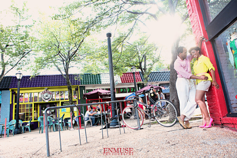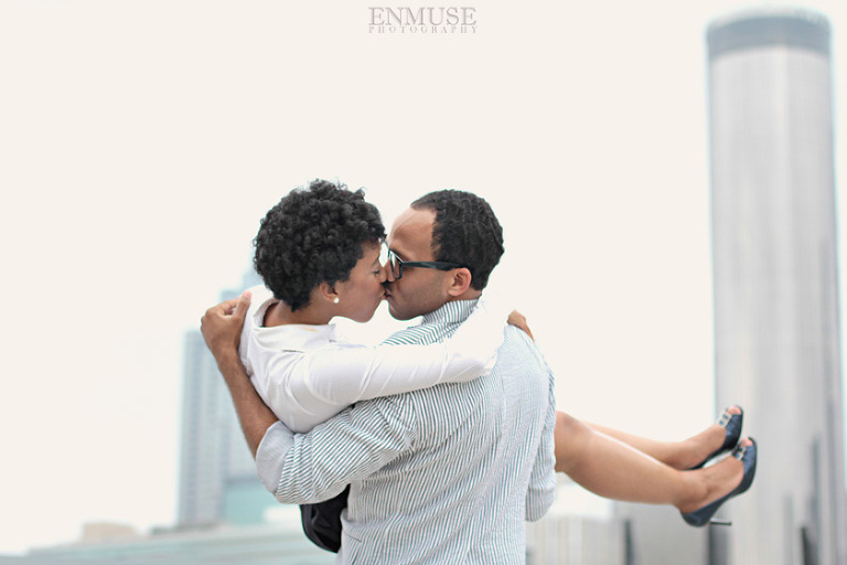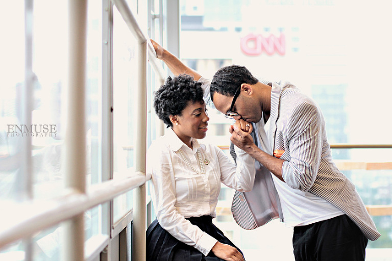 We then hopped over to the Little Five Points area where it is known for multitudes of graffiti and colored walls. Apparently the colors brought the “colorful” character of Tiffany and Michael as they did tons of fun and wacky expressions. Our next stop was the Glenn Hotel where we wanted to incorporate an editorial look of the lovebirds with the Atlanta skyline. Oh, and not to forget, their collegiate “capes” and fraternity/sorority icons: a pink mirror and a white cane.