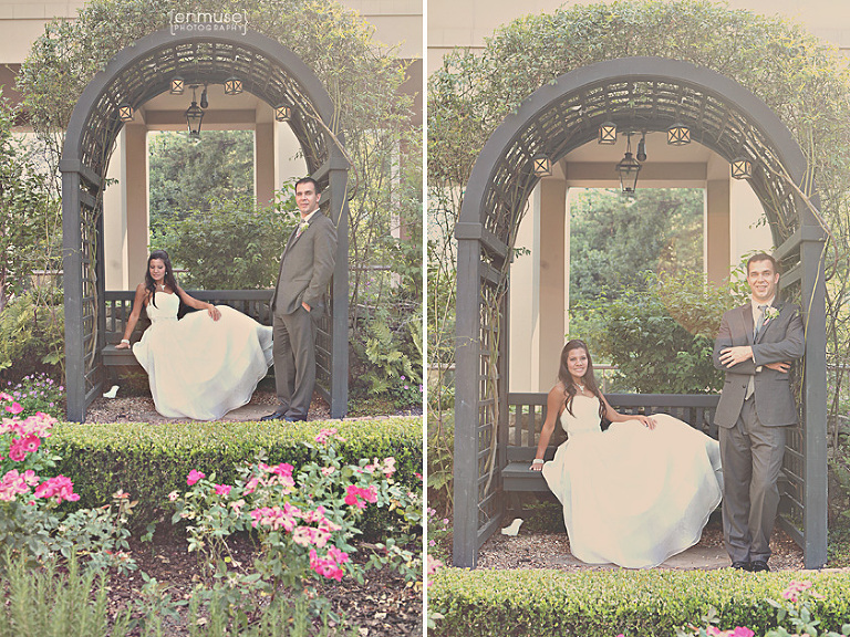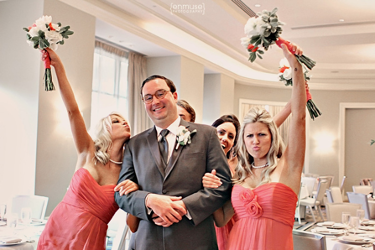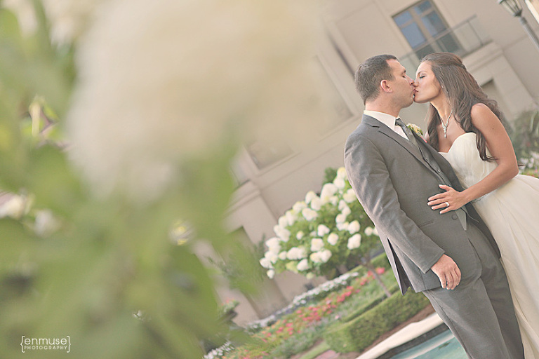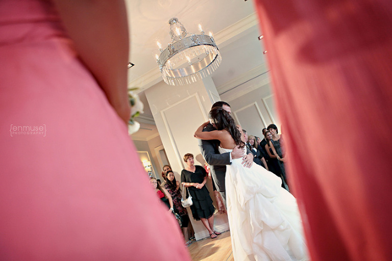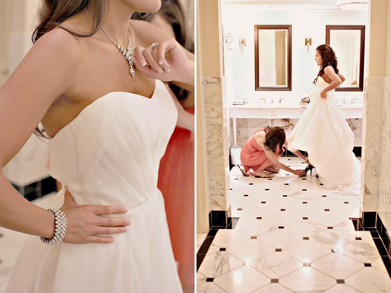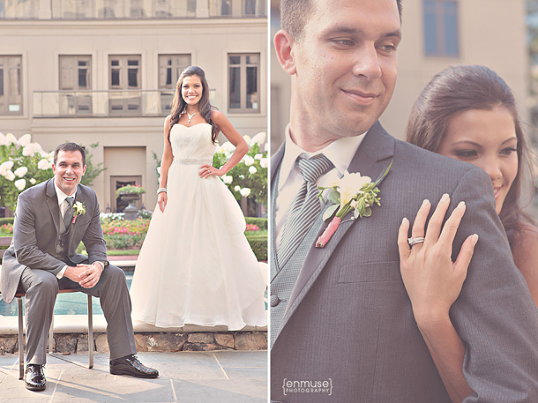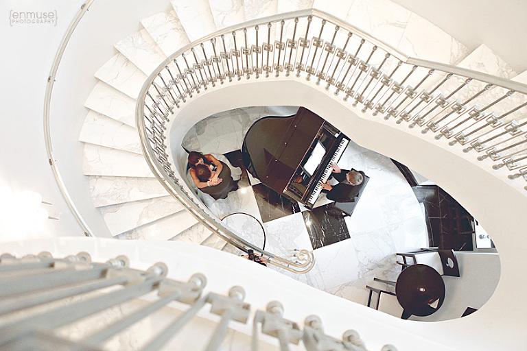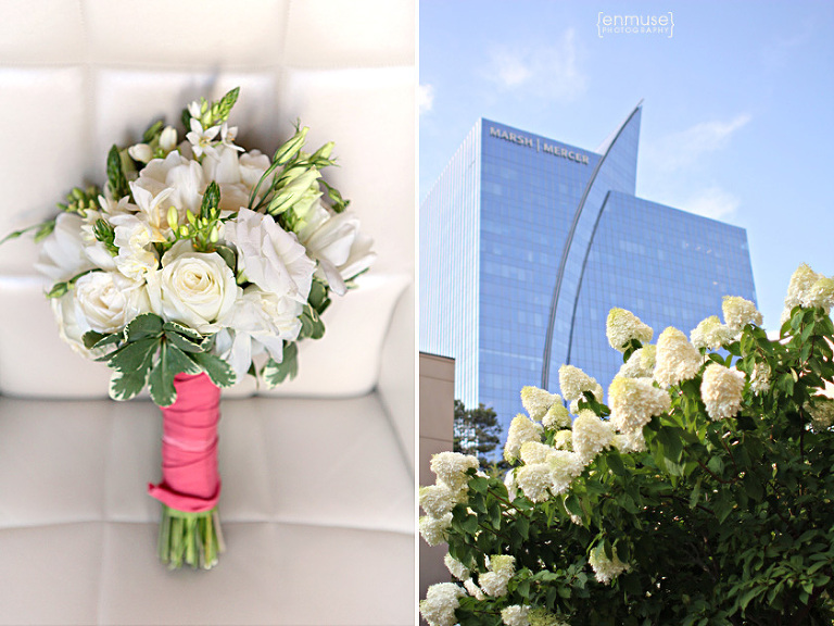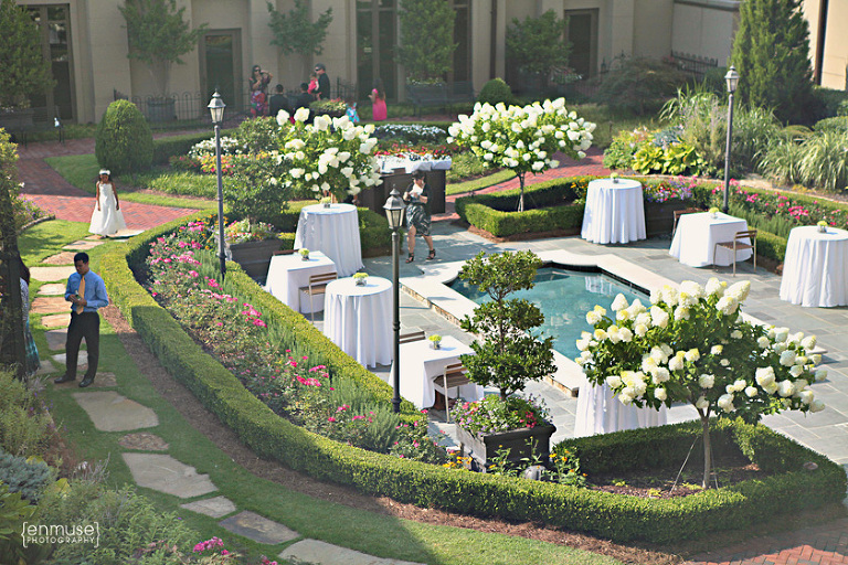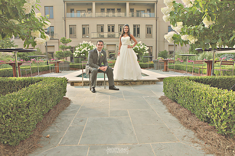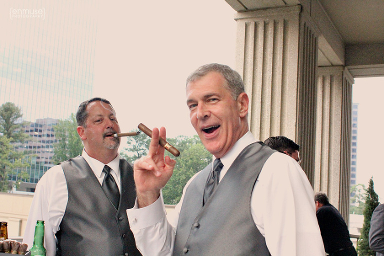 There is no better place to start and end Stephanie and Jim’s special day than the fittingly elegant Mandarin Oriental Atlanta Hotel in Buckhead (formerly The Mansion on Peachtree). Their modern airy interior combined with charming vintage details certainly make for a picturesque backdrop. So imagine our glee when Steph and Jim’s wedding planner extraordinaire, Donna from Confetti, let us worked in enough time for picture-taking within the schedule. Couple pics in the English garden? Check. Experimenting with The Dress and the girls’ Amsale coral dresses on the spiral stairwell? Check. We even had time to let the two enjoy a private slow dance next to the hotel’s piano man while we were clicking away from the top of the stairwell. It was PERFECT.