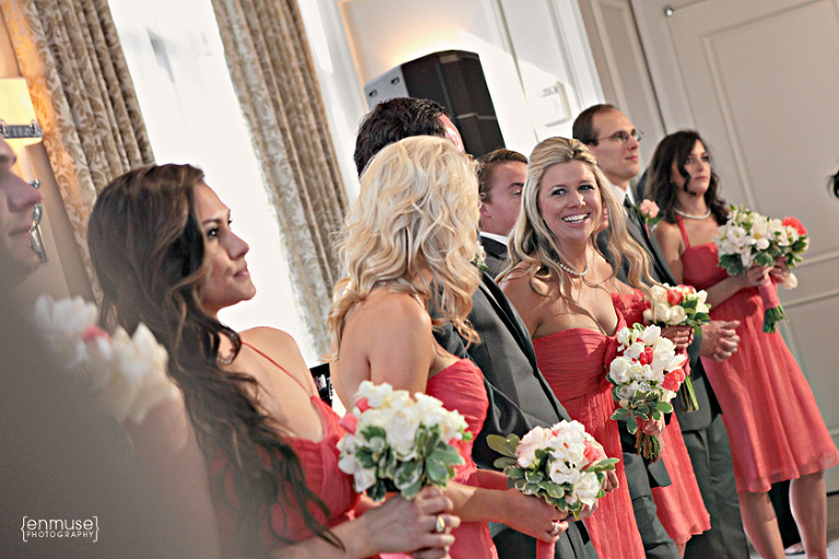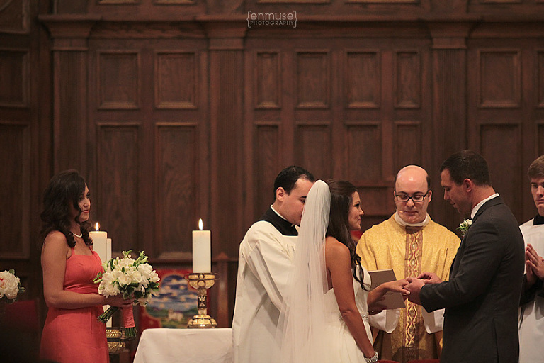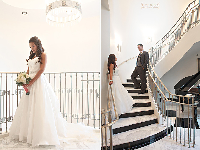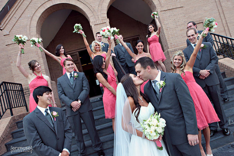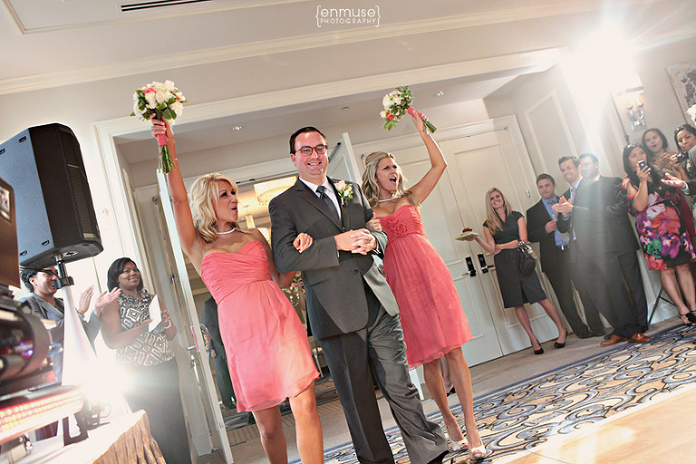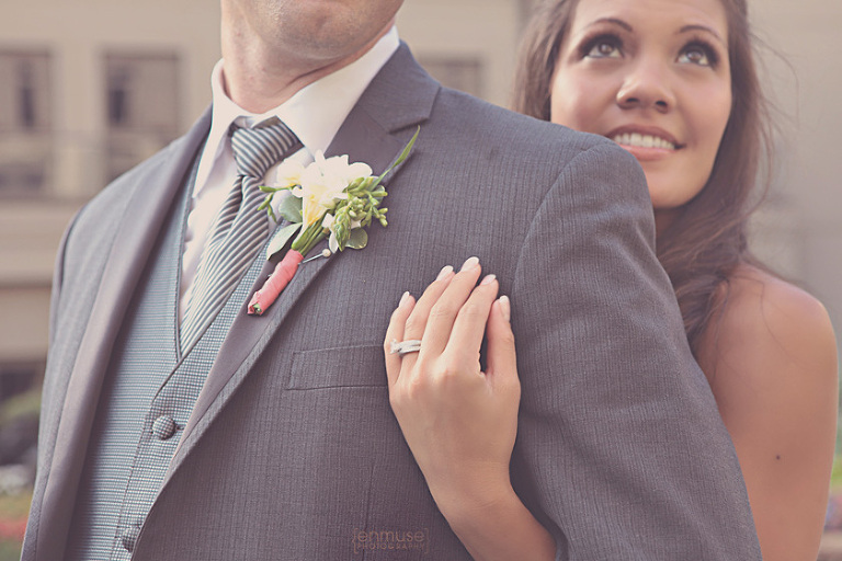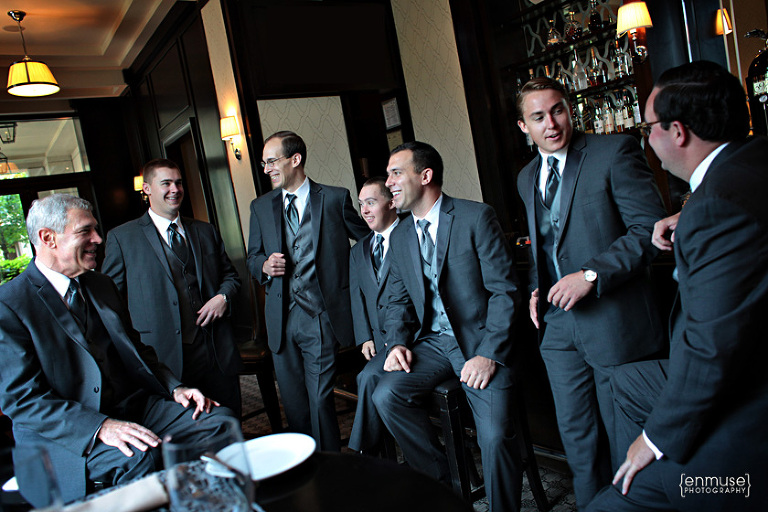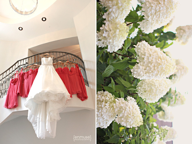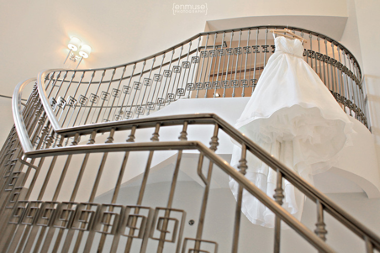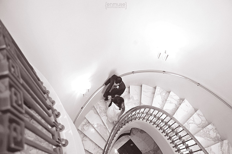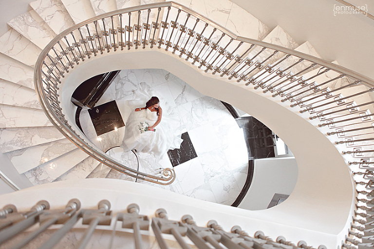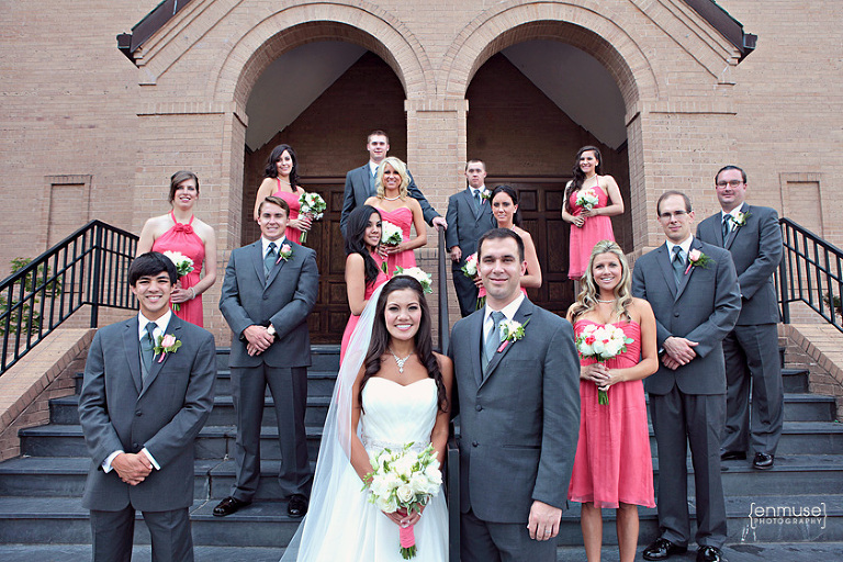There is no better place to start and end Stephanie and Jim’s special day than the fittingly elegant Mandarin Oriental Atlanta Hotel in Buckhead (formerly The Mansion on Peachtree). Their modern airy interior combined with charming vintage details certainly make for a picturesque backdrop. So imagine our glee when Steph and Jim’s wedding planner extraordinaire, Donna from Confetti, let us worked in enough time for picture-taking within the schedule. Couple pics in the English garden? Check. Experimenting with The Dress and the girls’ Amsale coral dresses on the spiral stairwell? Check. We even had time to let the two enjoy a private slow dance next to the hotel’s piano man while we were clicking away from the top of the stairwell. It was PERFECT.