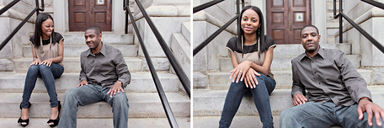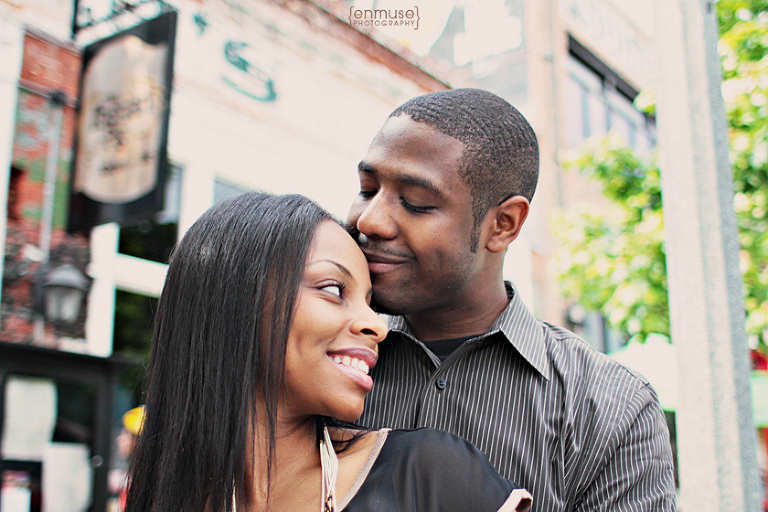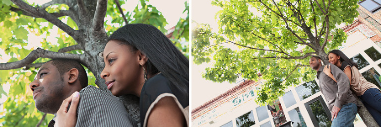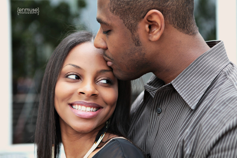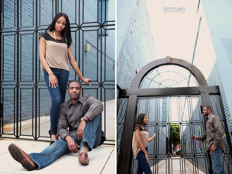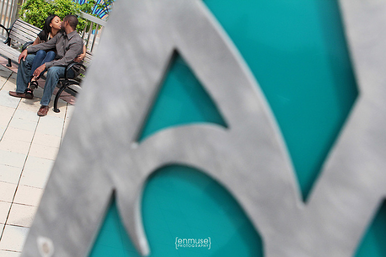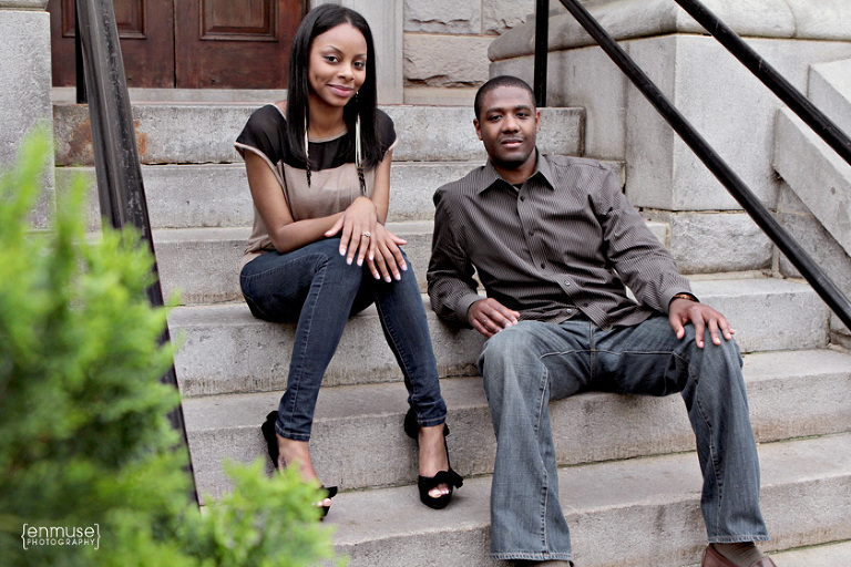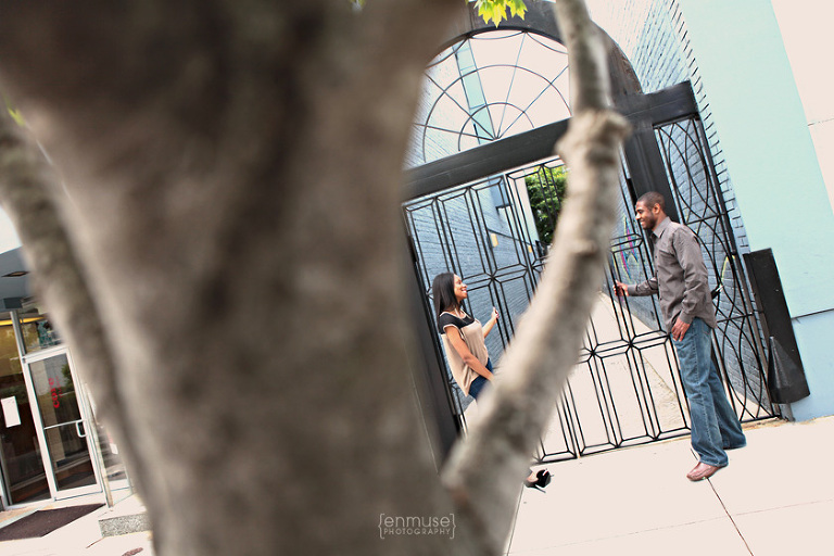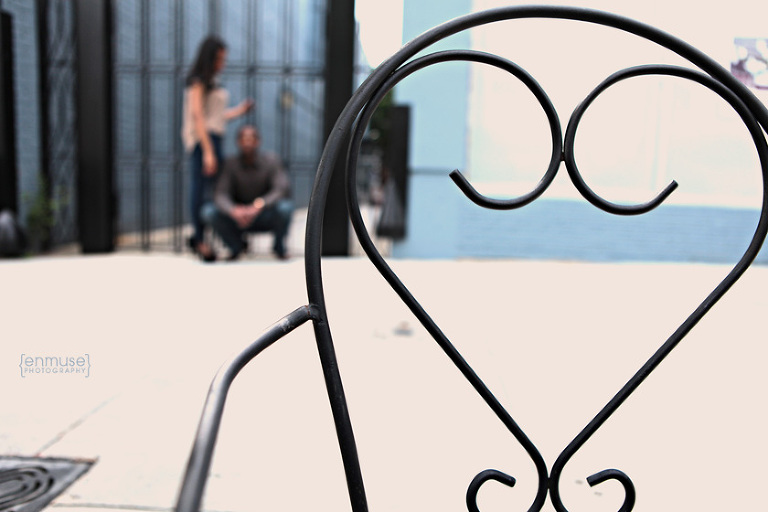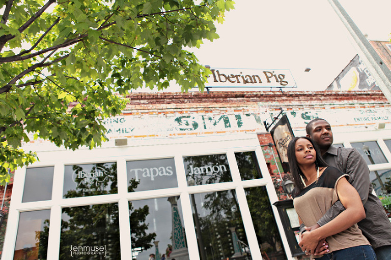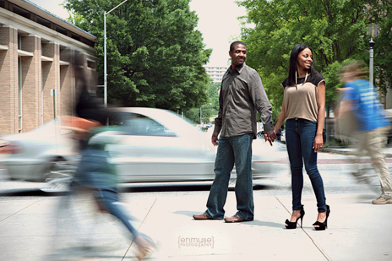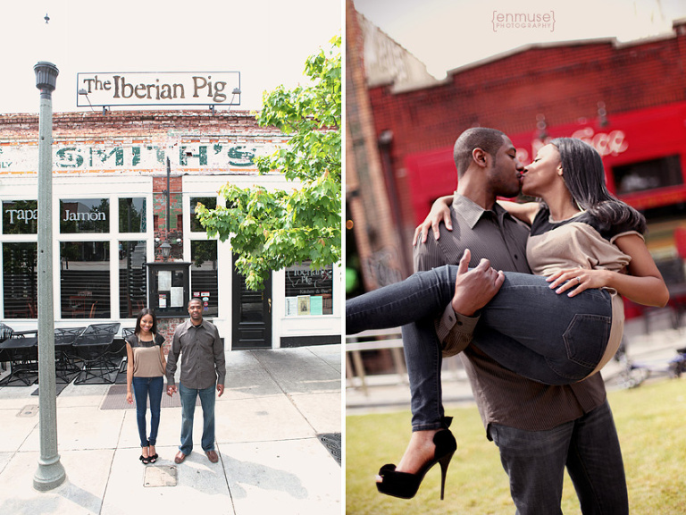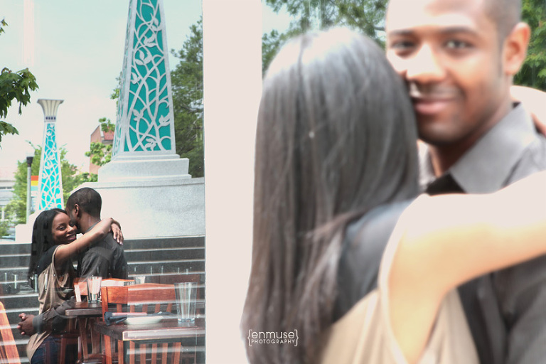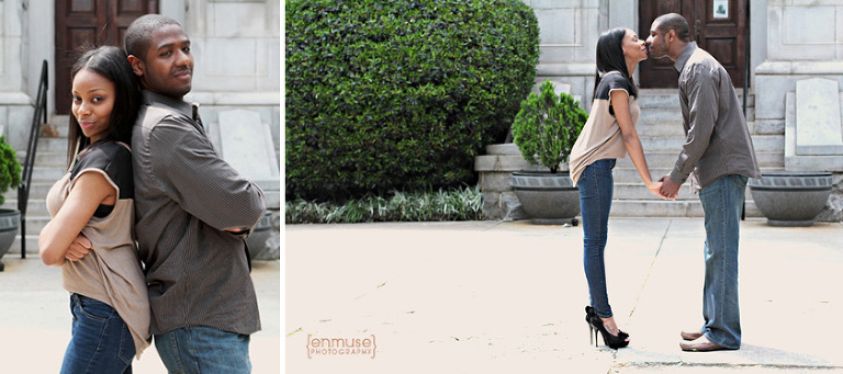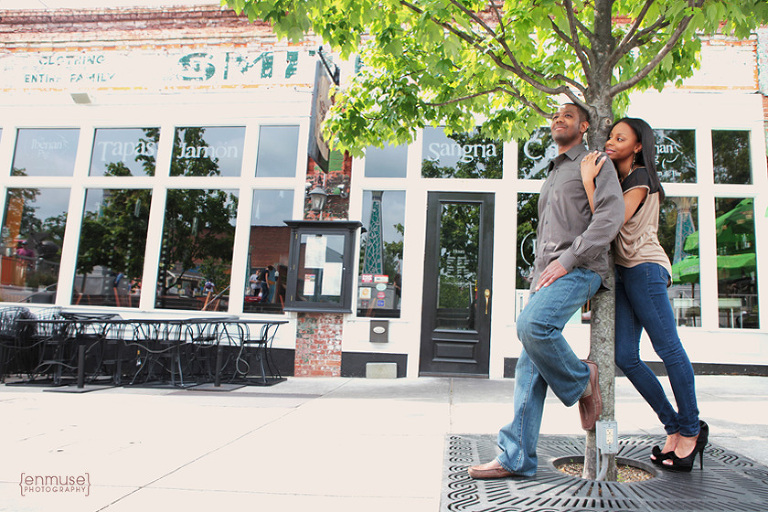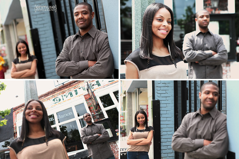 This time we decided on charming little downtown Decatur as the photo location. Their engagement session started quite early that Saturday morning because we wanted to have downtown Decatur all to ourselves and it was supposed to rain in the late morning. As it turns out, the downtown area was already filled with people jogging, walking their dogs and doing other Saturday morning activities by the time we got there. Oh well, at least it didn’t rain (although we did bring cool umbrellas to be used as props in case it did rain. Seriously, how cool would an “engagement-session-in-the-rain” be?)