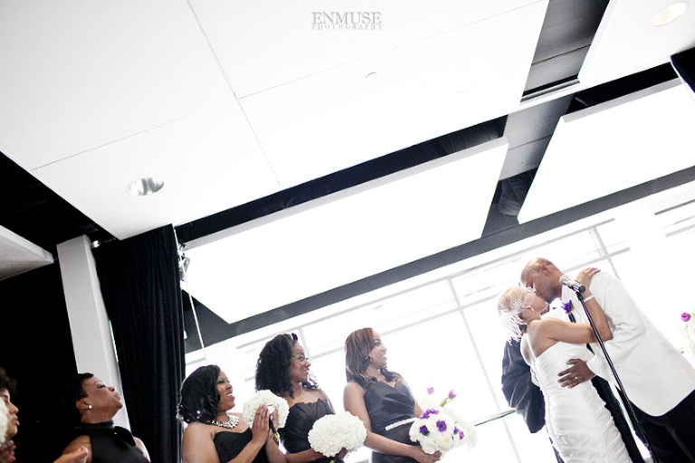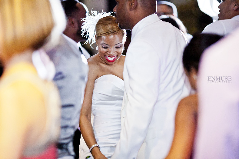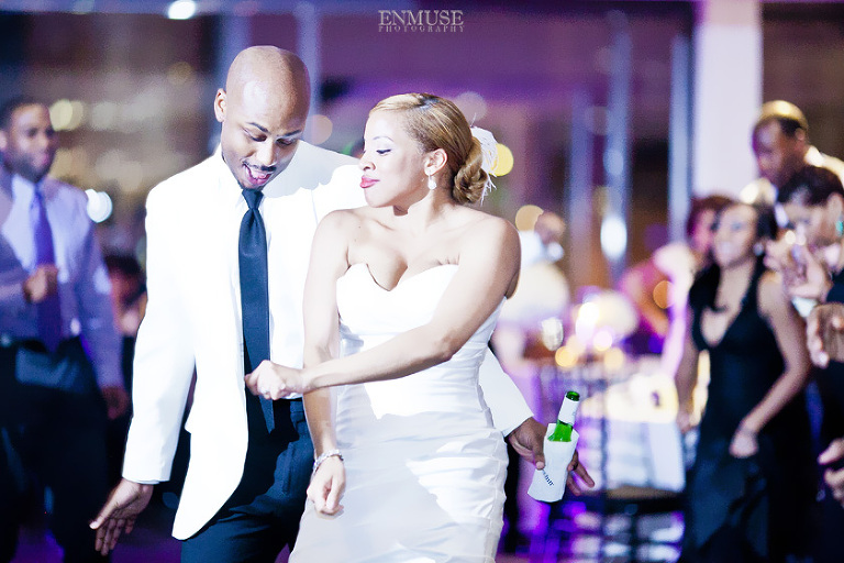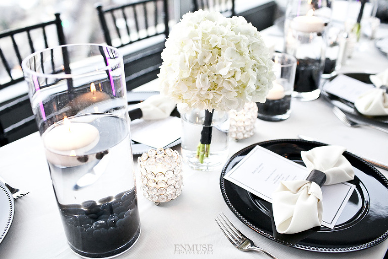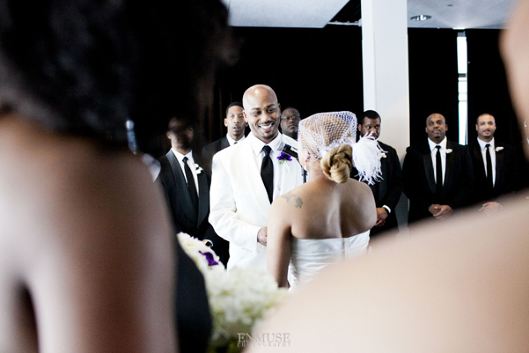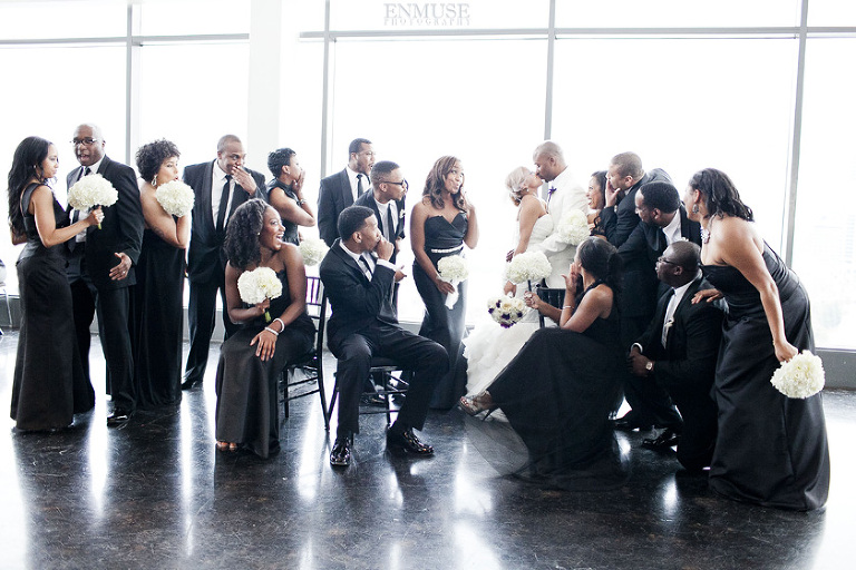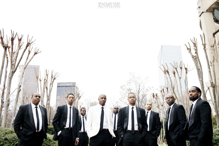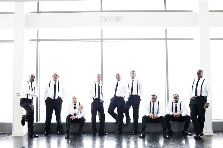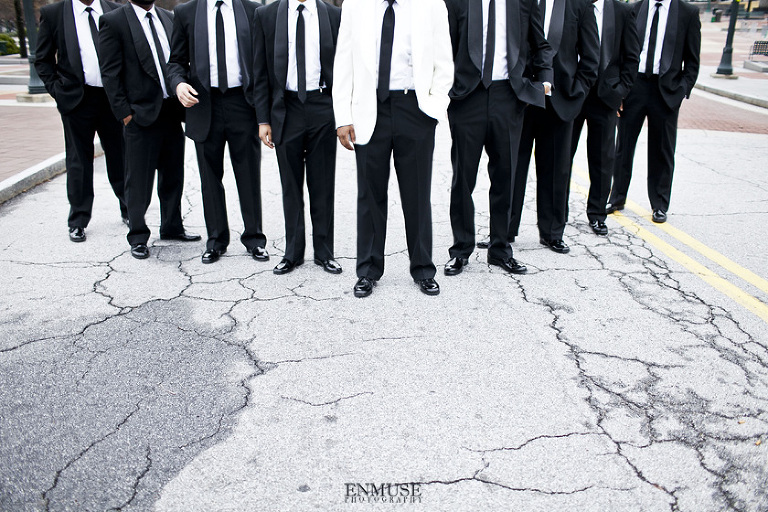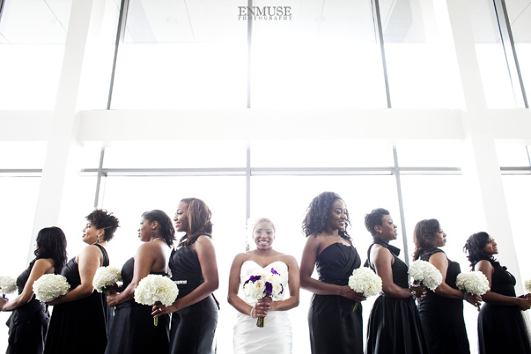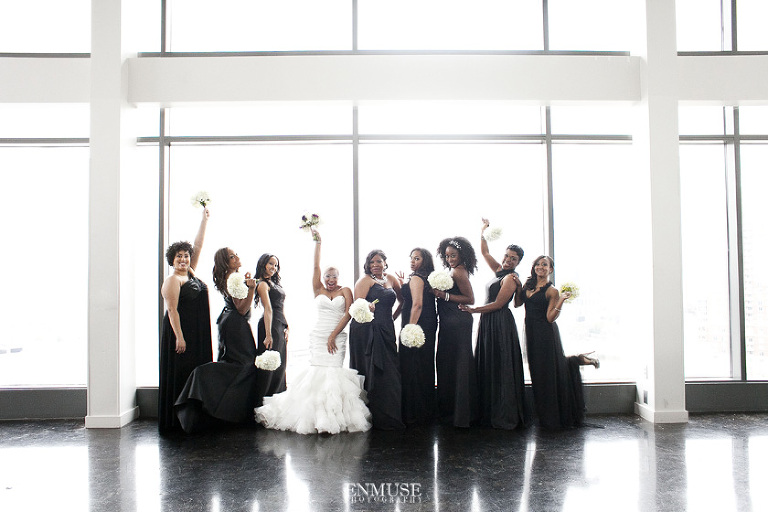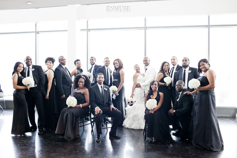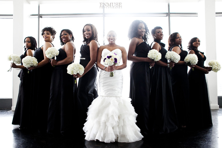 Remy and Lamont’s engagement session was the embodiment of high fashion, style and urban feel. So when it comes to planning their wedding, the couple stayed true to their vision and this “suit & tie”-esque wedding was born. The groom suited up in a classic white tux and black pants (think Jay-Z) while the groomsmen were wrapped in slick black tuxes. The bride looked angelic in her white dress and old Hollywood style veil while the bridesmaids were astonishing in various black dresses with elegant white hydrangea bouquets.