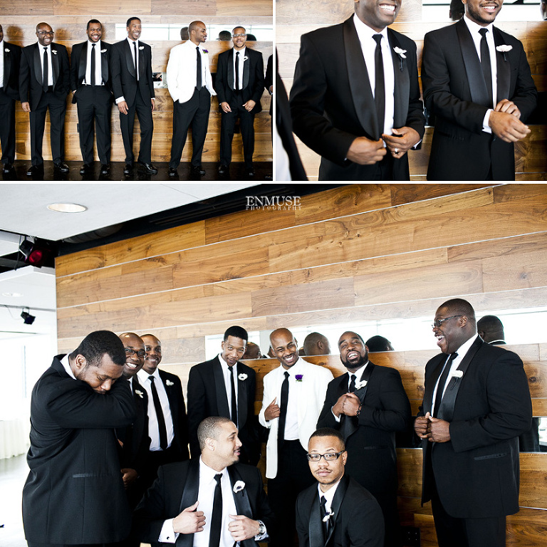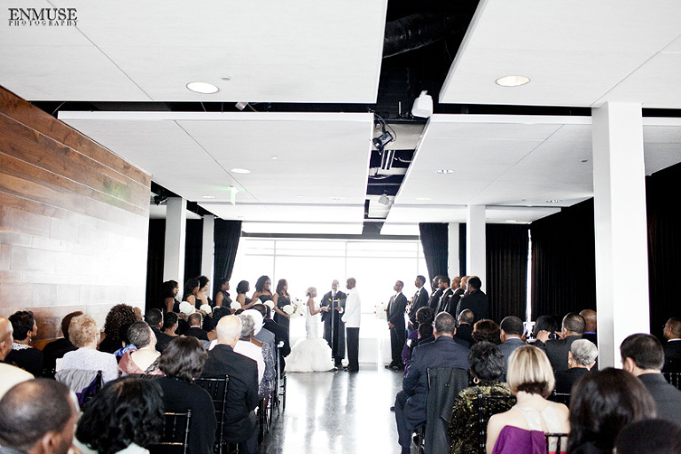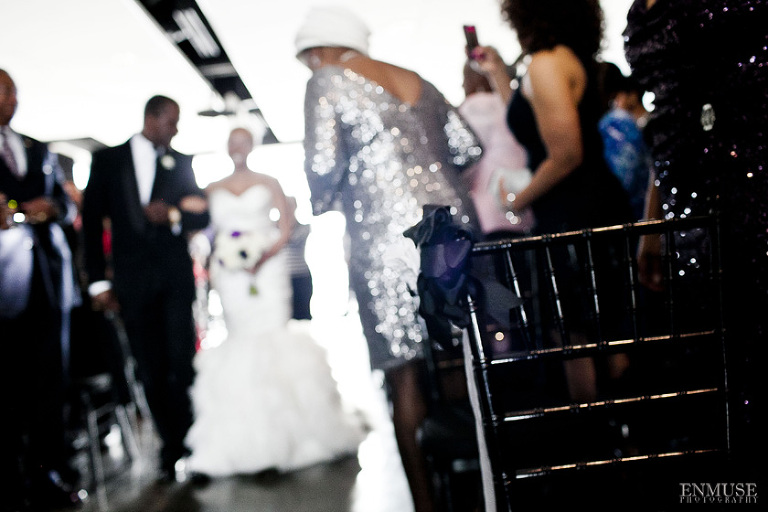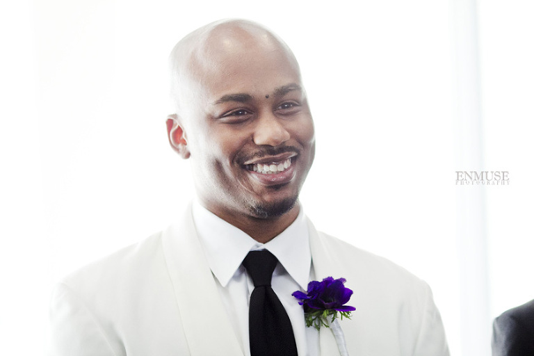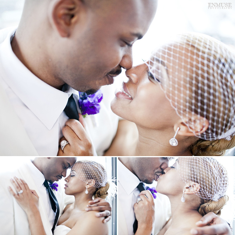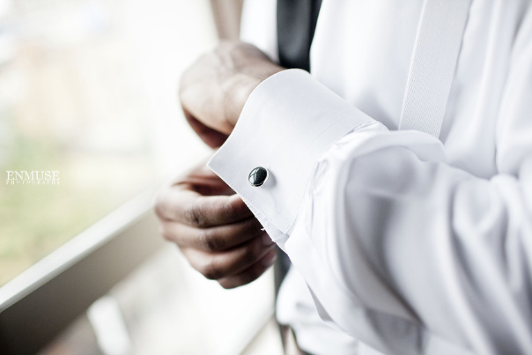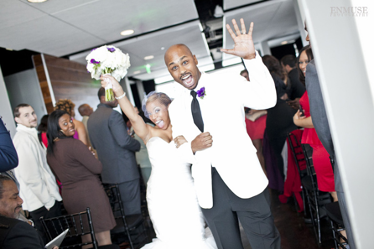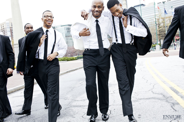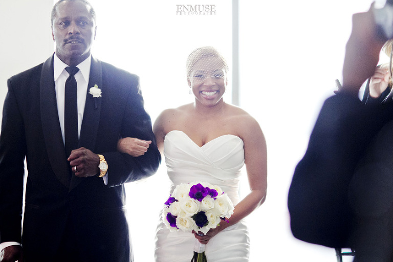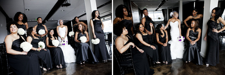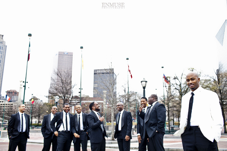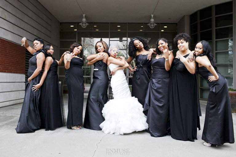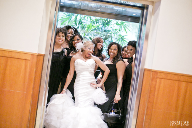 Remy and Lamont’s engagement session was the embodiment of high fashion, style and urban feel. So when it comes to planning their wedding, the couple stayed true to their vision and this “suit & tie”-esque wedding was born. The groom suited up in a classic white tux and black pants (think Jay-Z) while the groomsmen were wrapped in slick black tuxes. The bride looked angelic in her white dress and old Hollywood style veil while the bridesmaids were astonishing in various black dresses with elegant white hydrangea bouquets.