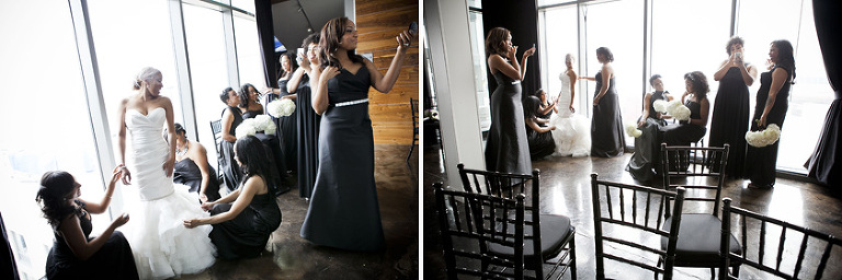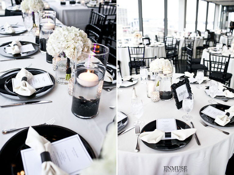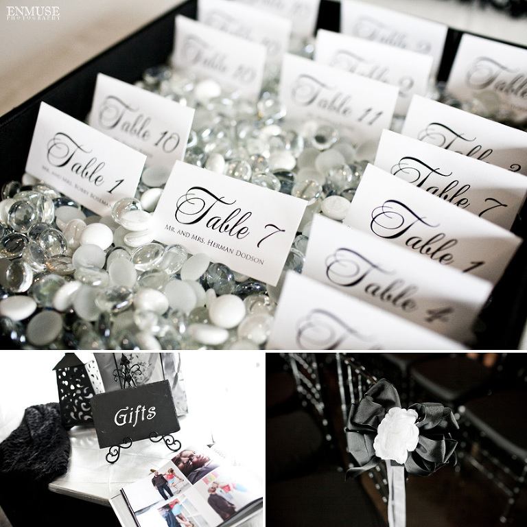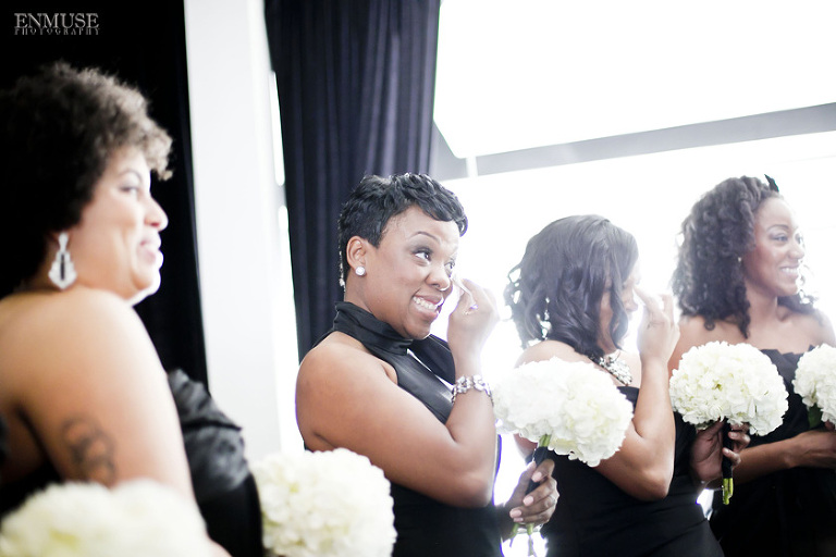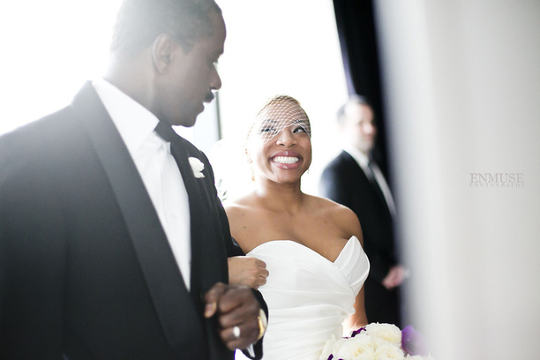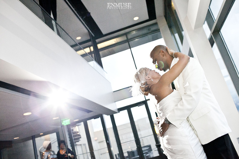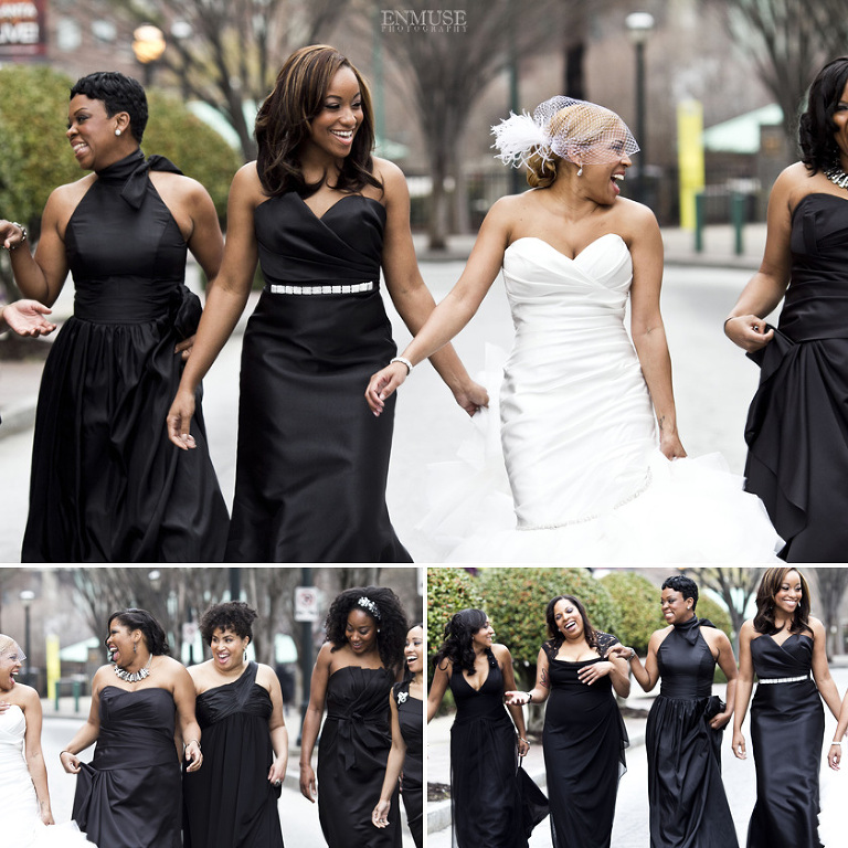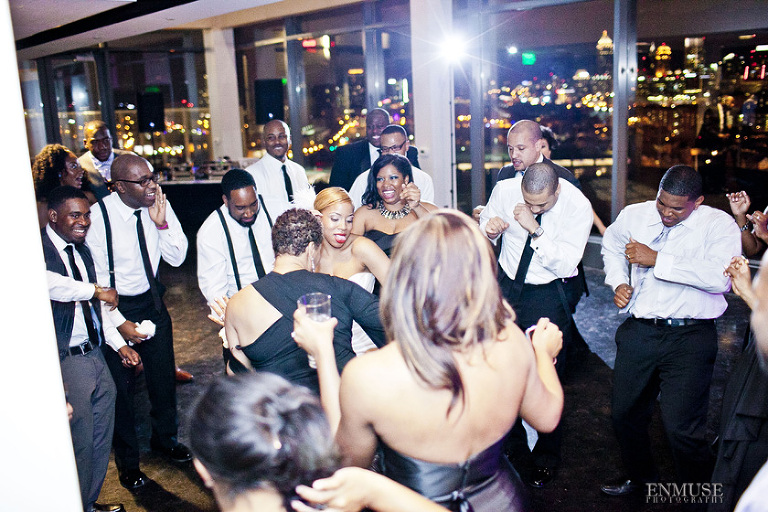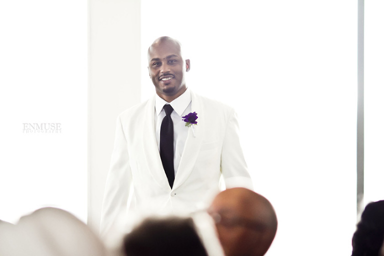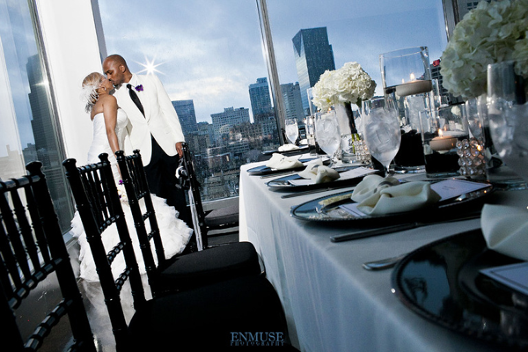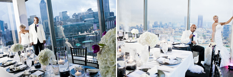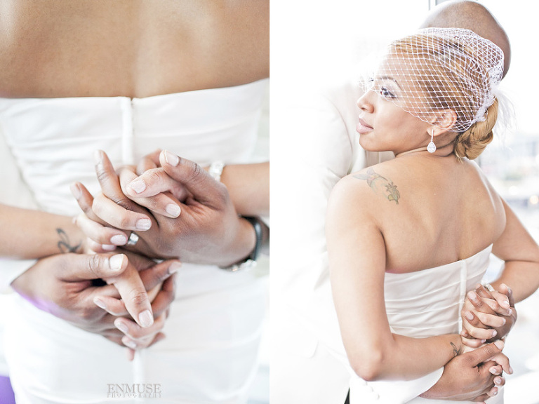 Remy and Lamont’s engagement session was the embodiment of high fashion, style and urban feel. So when it comes to planning their wedding, the couple stayed true to their vision and this “suit & tie”-esque wedding was born. The groom suited up in a classic white tux and black pants (think Jay-Z) while the groomsmen were wrapped in slick black tuxes. The bride looked angelic in her white dress and old Hollywood style veil while the bridesmaids were astonishing in various black dresses with elegant white hydrangea bouquets.
