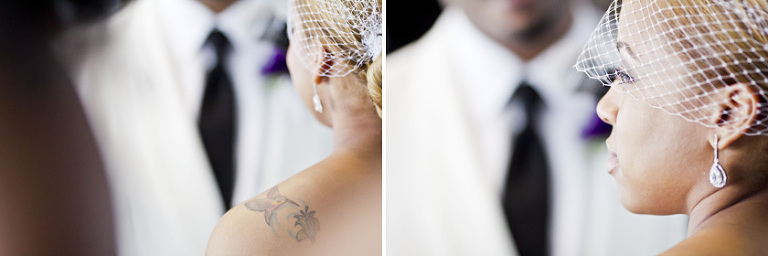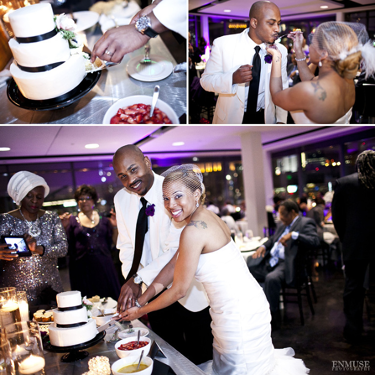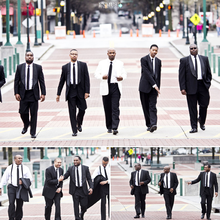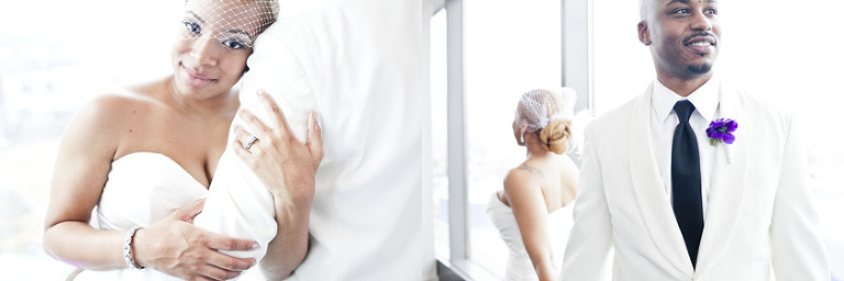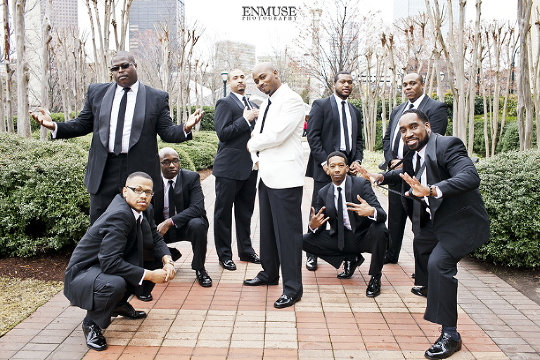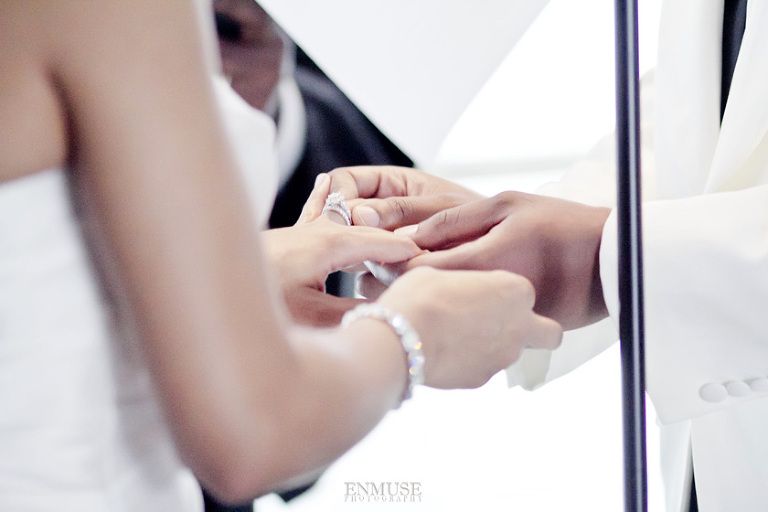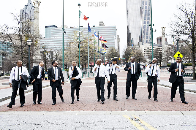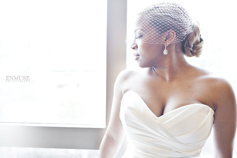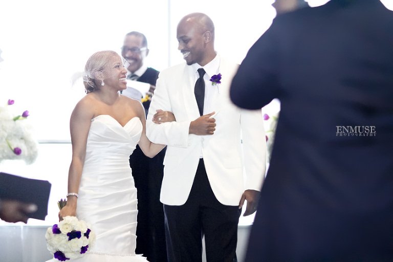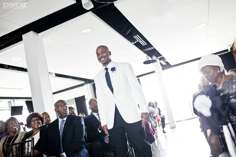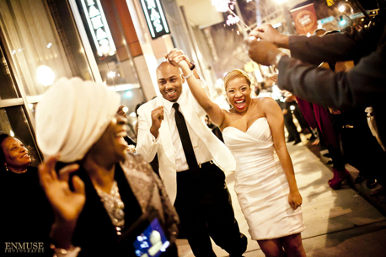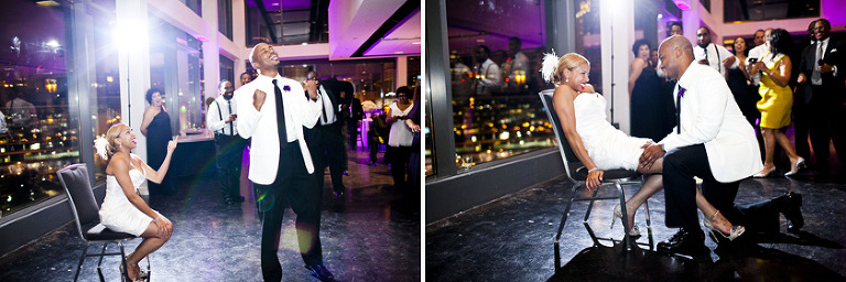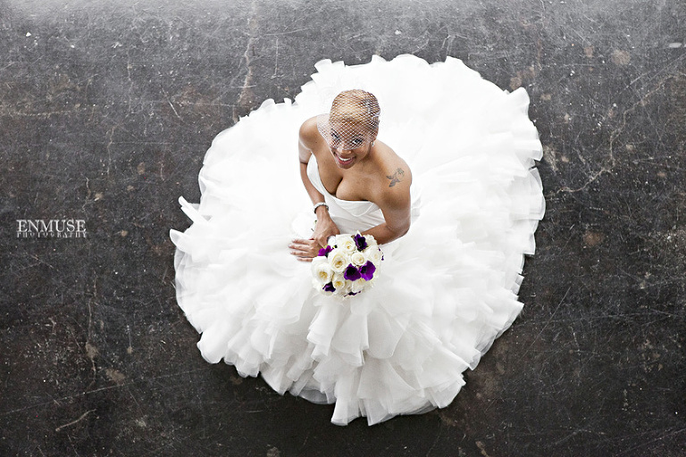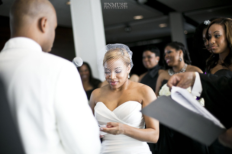 Remy and Lamont’s engagement session was the embodiment of high fashion, style and urban feel. So when it comes to planning their wedding, the couple stayed true to their vision and this “suit & tie”-esque wedding was born. The groom suited up in a classic white tux and black pants (think Jay-Z) while the groomsmen were wrapped in slick black tuxes. The bride looked angelic in her white dress and old Hollywood style veil while the bridesmaids were astonishing in various black dresses with elegant white hydrangea bouquets.